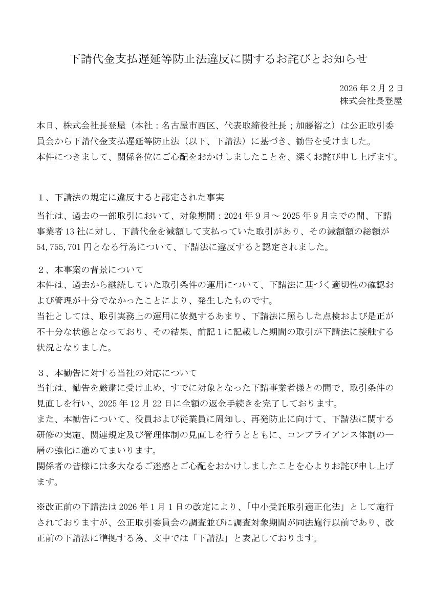 下請代金支払遅延等防止法違反に関するお詫びとお知らせ
